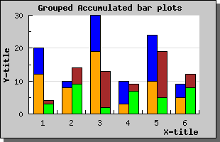 It is perfectly possible to combine the previous bar types to have grouped accumulated bar plots. This is done by just adding the different accumulated plots to a group bar plot, for example the following code would do that.
