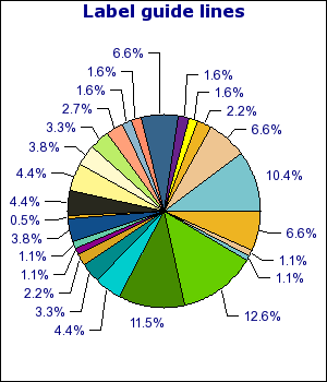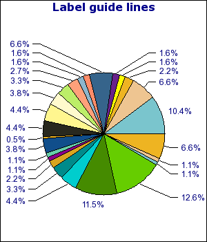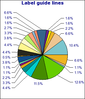 For very busy Pie plots it can become too little space for the labels to be printed just beside the pie slice. For this purpose it is possible to use guide lines for the labels. The library will then draw a line from the center edge of the slices to the label which will be positioned further out from the Pie Plot.