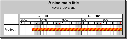 Time to show you an example of a Gantt chart and how easy it is to make one. Lets make it the simplest possible Gantt chart. One activity, named "Project", which lasts from "2001-11-01" to "2002-02-20".