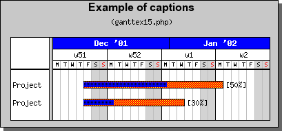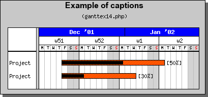 Set(0.4)In Figure 162 the previous example is modified to indicate the progress of each activity by the default progress indicator. A solid bar. To make it clearer we have also modified the caption to reflect the displayed progress. (At the same time we also modified the scale headers just to illustrate some more formatting options).